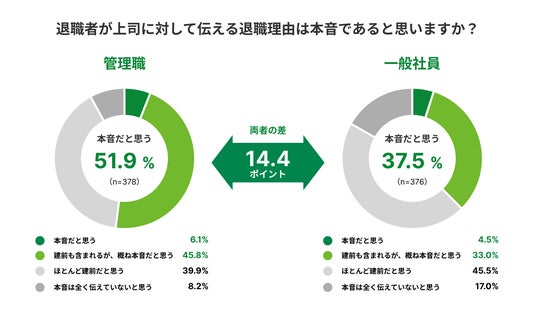 「退職者が上司に伝える理由は本音だと思うか」という問いでは、管理職の51.9%が「本音・概ね本音」だと回答しているのに対し、一般社員はわずか37.5%に留まりました。