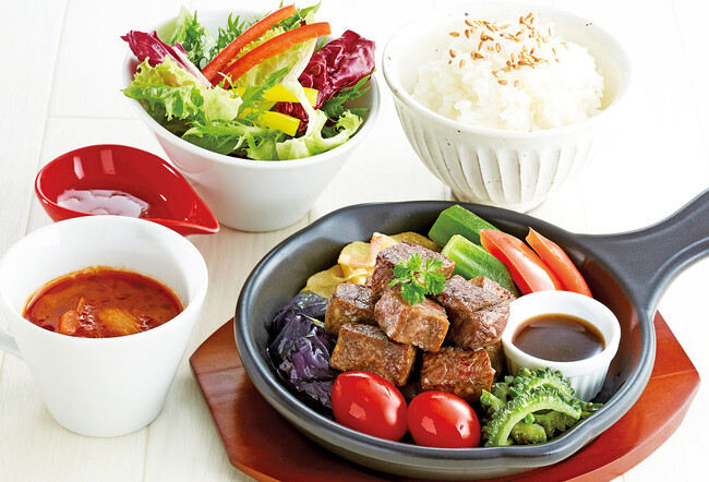 やわらかい牛サガリのサイコロステーキに夏野菜をトッピングしました。