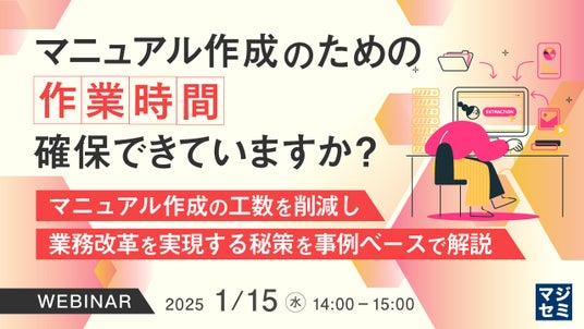 マニュアルトータルソリューションを提供する株式会社テンダ(本社/東京都渋谷区、代表取締役会長/小林 謙、以下「テンダ」)は、2025年1月15日(水)に、「マニュアル作成のための作業時間 確保できていますか?~マニュアル作成の工数を削減し、業務改革を実現する秘策を事例ベースで解説~」と題し、ウェビナーを開催いたします。