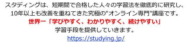 「スタディング」(https://studying.jp/)は、短期間で合格した人々の学習法を徹底的に研究し、10年以上も改善を重ねてきた究極のオンライン資格取得講座です。