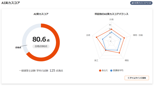 1級建築士試験において、この「AI実力スコア」は上記のような講座受講者の抱える課題を解決し、学習効率を飛躍的に向上させることが期待できます。「AI実力スコア」は、今試験を受けたら何点取れるかをAIが予測し、合格点をクリアするためにどの科目、どの単元で何点伸ばすべきかが一目瞭然となります。そのため、受講者自身での苦手科目や単元の管理が不要になり、試験合格に必要な部分を伸ばすことができますので、学習期間を短縮して効率的に試験合格を目指せます。