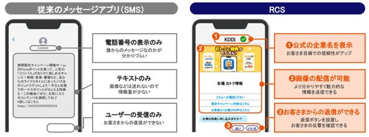 KDDI株式会社(本社:東京都千代田区、代表取締役社長 CEO:松田 浩路、以下 KDDI)とSupership株式会社(本社:東京都港区、代表取締役社長CEO:稲葉 真吾)は2025年5月20日から、法人向けメッセージ配信サービス「KDDI Message Cast( https://kddimessagecast.jp/ )」が、Google メッセージ・iOS メッセージアプリへのRCS(Rich Communication Services)の配信に対応することをお知らせします。なお、同日開始するKDDIの認証済の表示がされるRCS公式アカウントとして配信できるため、受信するお客さまは安心してメッセージを開くことができます。