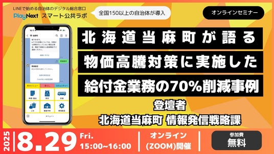 プレイネクストラボ株式会社(本社:東京都品川区、代表取締役:柏 匠、以下 プレイネクストラボ)はLINEで始める自治体のデジタル総合窓口「スマート公共ラボ」の活用事例セミナーとして「北海道当麻町の事例」を無料で8月29日(金)15時より開催します。