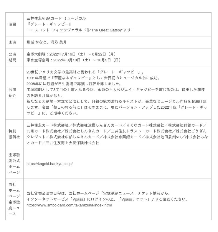 三井住友カード株式会社(本社:東京都江東区、代表取締役社長:大西 幸彦、以下:三井住友カード)は宝塚歌劇月組公演『グレート・ギャツビー』(宝塚大劇場:2022年7月16日~8月22日/東京宝塚劇場:2022年9月10日~10月9日)に協賛いたします。