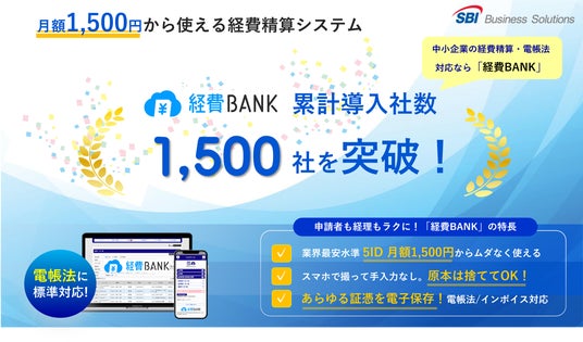 総合フィンテックソリューション企業であるSBI FinTech Solutions株式会社の子会社で、バックオフィス支援サービスを提供するSBIビジネス・ソリューションズ株式会社(本社:東京都港区、代表取締役社長:夏川 雅貴、以下「当社」)は、中小企業の経費精算と電帳法・インボイス制度対応をサポートするクラウド型経費精算システム「経費BANK」が、累計導入社数1,500社を突破しましたのでお知らせいたします。