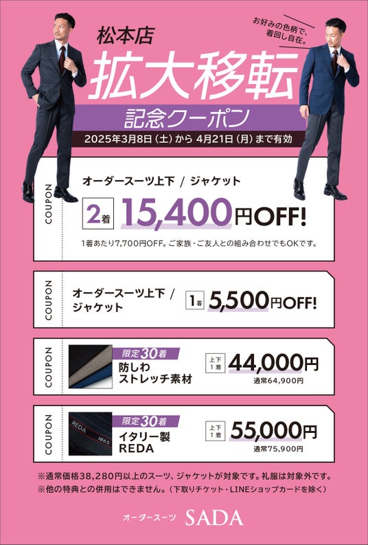 初回19,800円(税込21,780円)~オーダースーツを提供する株式会社オーダースーツSADA(本社:東京都千代田区、代表取締役社長:佐田展隆)は、「松本店」を2025年3月8日(土)にオープンいたします。また、記念としてオープニングセールを開催いたします。