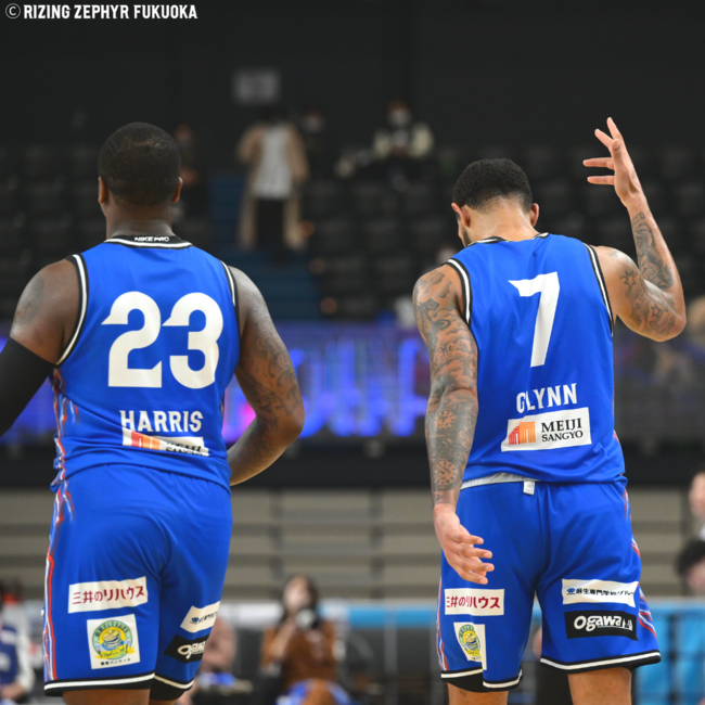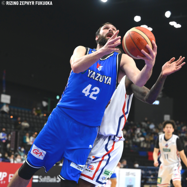 連敗を脱出したい福岡は、スターティング5に新加入の#42コッツァーを起用。一回り大きい青森のゴール下に負けず、リバウンドやセカンドチャンスを決め主導権を握る。青森#8下山の3連続3Pシュートを決められ点差を縮められるも、#6大塚、#1阿部の3Pシュートで再び6点リード。前半終了残り4.7秒には#23ハリスがトップスピードでコートを駆け抜けフィニッシュ。39-32とブザービーターで会場を湧かせた。