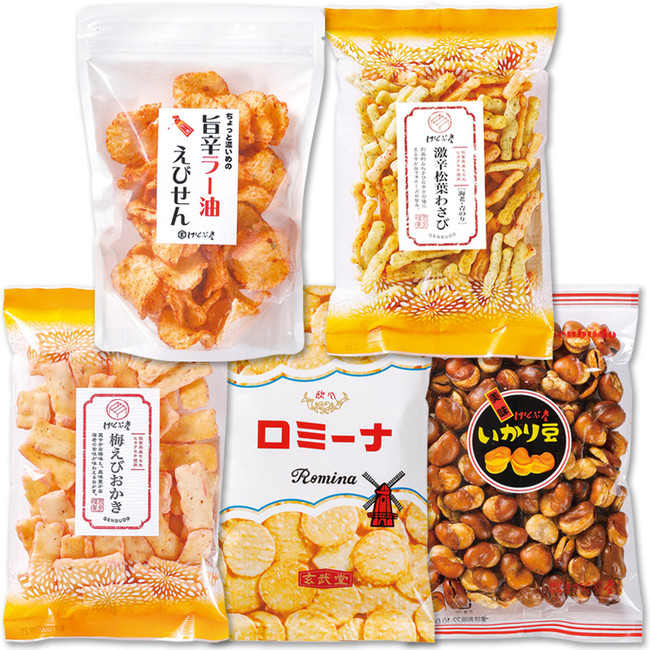 【セット内容】5袋入 (旨辛ラー油えびせん、激辛松葉わさび、梅えびおかき、ロミーナ、いかり豆)