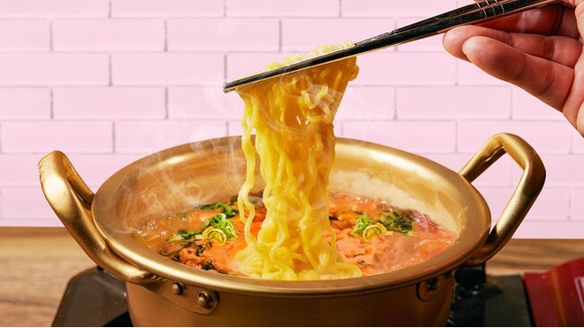 韓国で話題の新アレンジ!『辛ラーメン』にヘルシーな豆乳とたっぷりチーズを加えて、濃厚クリーミー&旨辛に仕上げました!豆乳が辛さをやわらげるので、辛いのが苦手な方でも食べやすい味わいに♪韓国ドラマでおなじみの黄金鍋で食べれば韓国気分を味わえます!