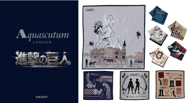 (右)『進撃の巨人』の代表的なイラストをベースにしたプリントハンカチです。進撃の巨人(エレン)と調査兵団が、アクアスキュータムの発祥であるイギリスのロンドンに登場するシーンをイメージしています。コラボレーション感溢れるデザインに仕上がっています。