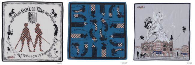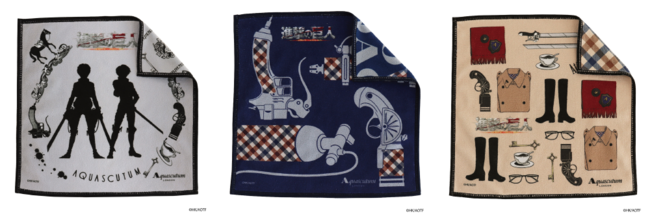 (中)『進撃の巨人』を象徴する立体機動装置をモチーフにしたプリントハンカチです。モチーフには、アクアスキュータムのアイコンであるクラブチェック柄を組み合わせたユニークなデザインの商品です。