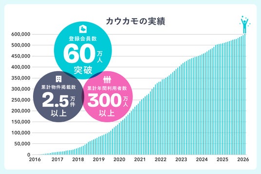 こうした背景の中、カウカモは、単なる物件仲介に留まらない「自分の暮らしに合わせた住まい」を手に入れるためのあらゆる手段を提供し続け、会員数60万人を達成。年間の累計利用者数は300万人を超え、サービス開始から現在までの累計物件掲載数は2.5万件以上となりました。