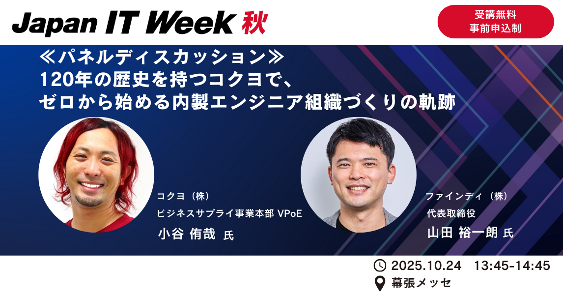 エンジニアプラットフォームを提供するファインディ株式会社(東京都品川区、代表取締役:山田 裕一朗、以下「当社」)は、2025年10月24日(金)に幕張メッセで開催される「Japan IT Week[秋]カンファレンス2025 」内の「Japan IT Weekカンファレンス」にて、コクヨ株式会社 ビジネスサプライ事業本部 VPoE 小谷 侑哉氏と共に登壇することを発表します。