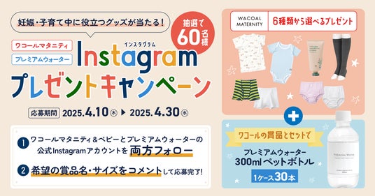 本キャンペーンは、Instagramでワコールマタニティ&ベビーとプレミアムウォーターの公式アカウントを両方フォローし、対象の投稿に「希望の賞品名」、「サイズ」をコメントしていただいた方の中から抽選で60名様にワコールマタニティ&ベビーとプレミアムウォーターのおすすめ賞品をプレゼントいたします。