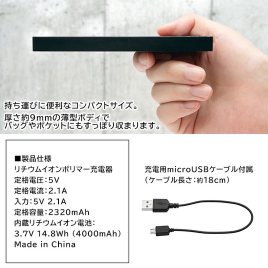 【材質・仕様等】ABS、ガラス/電池容量 4,000mAh/入出力 2.1A/PSE認証済/充電用microUSBケーブル付属