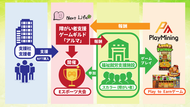 今回のパートナーシップで、Next LifeはDEAが運営するNFTゲームプラットフォーム「PlayMining」上のデジタル資産・ゲームアイテムのNFTを障がい者支援者の投資資金を活用して購入し、障がい者支援ゲームギルド「アルマ」を通じて、日本国内の障がい者の就労の選択肢を増やす取り組みを行います。