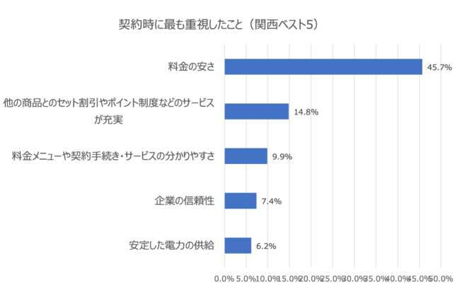 現在の電力会社と契約する際に最も重視したポイントは、関東・関西ともに「料金の安さ」が最も多く、次いで「他の商品とのセット割引やポイント制度などのサービスが充実」という結果に(上記グラフ)。関東エリアでは「安定した電力の供給」「インセンティブ」が重視されているのに対し、関西エリアでは「手続き・サービスの分かりやすさ」「企業の信頼性」となりました。