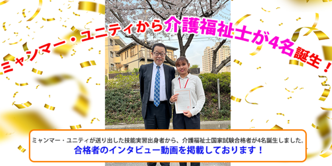 この度、ミャンマー・ユニティが送り出した技能実習出身者から、介護福祉士国家試験合格者が4名誕生しました。