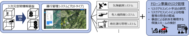 今回、3次元空間情報基盤と本プロジェクトで開発する運行管理システムを連接したビジネスモデルの経済価値について検証します。また、ユースケースごとにリスクアセスメントを実施し、その結果をもとに運行管理システムと連携したドローン事業者向けの損害保険スキームを検討します。