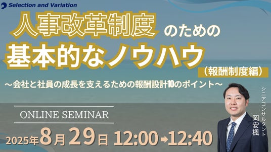 組織・人事コンサルティングファームであるセレクションアンドバリエーション株式会社(以下、当社、東京都千代田区丸の内、大阪市西区、名古屋市西区 / 代表取締役社長:平康慶浩/ URL:https://sele-vari.co.jp/ )は『人事制度改革のための基本的なノウハウ(報酬制度編) ~ 会社と社員の成長を支えるための報酬設計10のポイント~』セミナーを2025年8月29日(金)12:00~12:40に開催することをお知らせいたします。