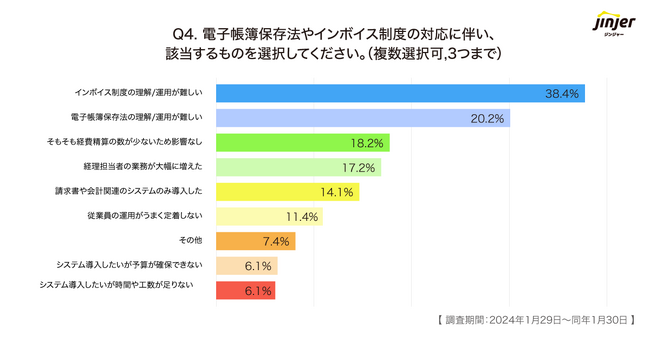 「電子帳簿保存法やインボイス制度の対応に伴い、該当するものを選択してください」という質問に対し、「インボイス制度の理解/運用が難しい」「電子帳簿保存法の理解/運用が難しい」という回答が、計58.6%となり、制度の理解や運用に課題を感じている企業が多く見られました。他にも「経理担当者の業務が大幅に増えた」が17.2%、「従業員の運用がうまく定着しない」が11.4%と、制度の運用に関して課題を感じている企業が目立ちました。