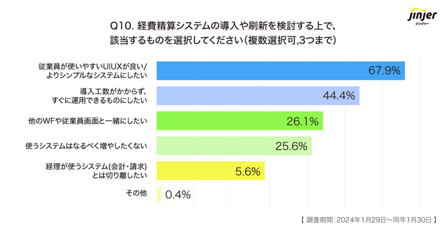 また、約25%の企業が「使うシステムはなるべく増やしたくない」と回答しており、経費精算システムの導入により、かえって工数が増えてしまうことを懸念する声も見られました。