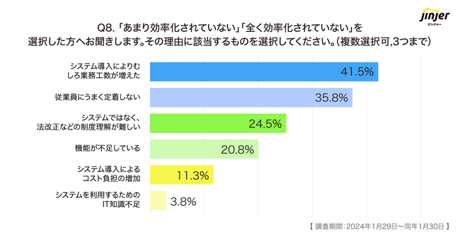 Q7で「あまり効率化できていない」「全く効率化できていない」と回答した方に向け、その理由について質問したところ、以下のような結果となりました。
