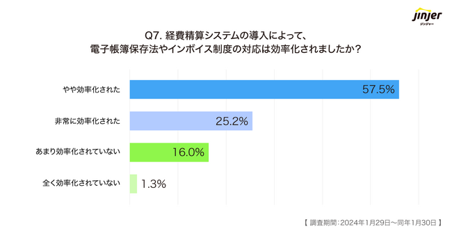 「経費精算システムの導入によって、電子帳簿保存法やインボイス制度への対応は効率化されたか」という質問に対し、「やや効率化された」が57.5%、「非常に効率化された」が25.2%と、約80%の企業が効率化を実感しているという結果になりました。