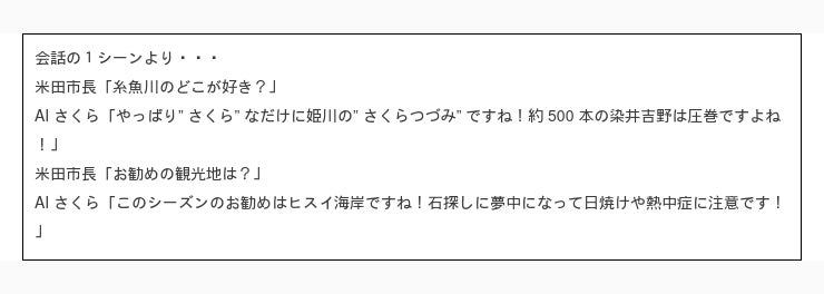 一般社団法人糸魚川市観光協会(本部:新潟県糸魚川市、会長 龍見和弦 以下 糸魚川市観光協会)は 2023 年 8 月 1 日より糸魚川駅(JR/ えちごトキめき鉄道)改札前自由通路に AI アバターによる接客 ソ リューション「AI さくらさん」を導入した。