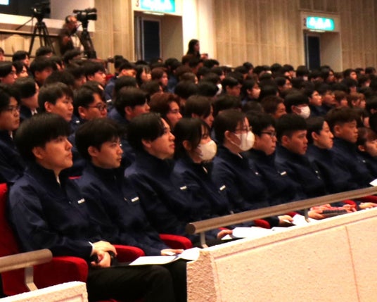 本日、アイシン安城地区にて入社式が行われ、当社取締役社長の吉田 守孝から新入社員へ、歓迎と激励のメッセージが送られました。