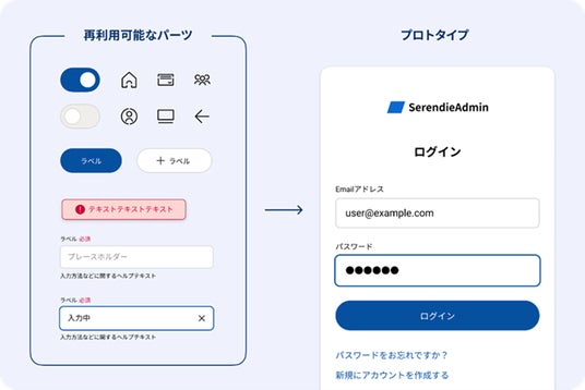 「Serendie Design System」は、当社の多様な事業領域で培われた知見を集約し、再利用可能で豊富な数のデザインパーツを有する、当社初の事業領域を横断したデザインシステムです。本システムは、「Figma」を活用し、利便性や操作性を考慮して設計されたデザインパーツを組み合わせるだけで、簡単にUIデザインの作成が可能で、高品質で統一感のあるUIを簡単に構築できます。また、「Figma」とWebアプリケーション開発で広く利用されているJavaScriptのライブラリーである「React」の連携により、デザインから実装への移行を大幅に効率化できるため、開発期間の短縮に貢献します。さらに、動くプロトタイプを短時間で作成して、ユーザーからのフィードバックを得ながら迅速にUIデザインを改善できるため、PoC(※6)開発にも最適なツールです。
