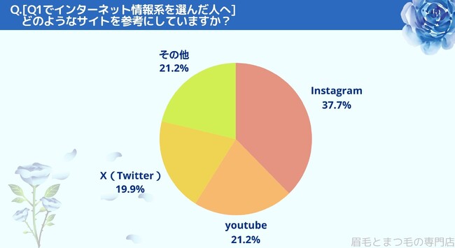 どのようなサイトを参考にしているかお聞きしたところ「Instagram(37.7%)」、「youtube(21.2%)」、「X(Twitter)(19.9%)」、「その他(21.2%)」という結果になりました。