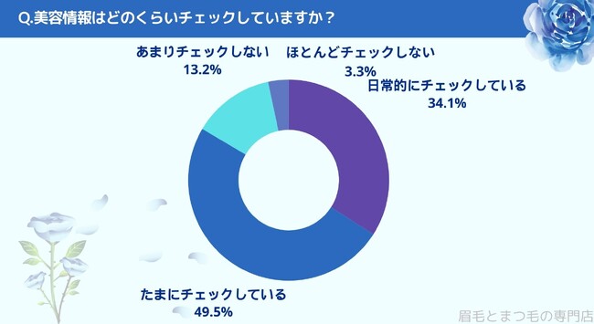 美容情報はどのくらいチェックするかお聞きしたところ「日常的にチェックしている(34.1%)」、「たまにチェックしている(49.5%)」、「あまりチェックしない(13.2%)」、「ほとんどチェックしない(3.3%)」という結果になりました。