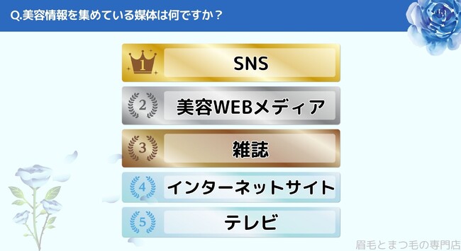 美容情報を集めている媒体をお聞きしたところ「1位>SNS」、「2位>美容WEBメディア」、「3位>雑誌」、「4位>インターネットサイト」、「5位>テレビ」という結果になりました。