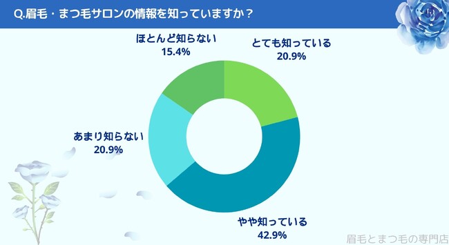 眉毛・まつ毛サロンの情報を知っているかお聞きしたところ「とても知っている(20.9%)」、「やや知っている(42.9%)」、「あまり知らない(20.9%)」、「ほとんど知らない(15.4%)」という結果になりました。