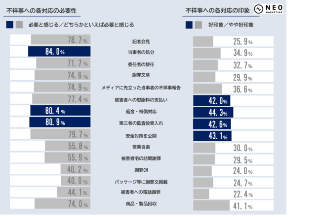 しかし、それにわずか1.2ポイント差で「安全対策を公開」が続きます。「返金・補償対応」や「慰謝料の支払い」のような、金銭面での対応はやはり好印象である一方で、「安全対策を公開」や「第三者の監査役受入れ」のような、今後の対策を具体的に行動で示す姿勢は好印象となるようです。