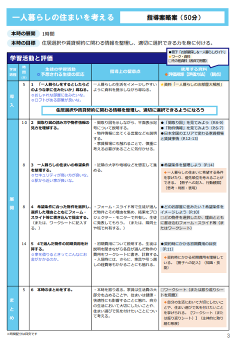 今回のアップデートでは、教材内容の充実に加え、授業として成立する住教育を実現するための「指導案ガイド」を新たに整備しました。住生活は高校生にとって実体験が少なく、知識として理解できても、自身の将来の生活と結びつけて考えることが難しい分野です。教育現場では、限られた授業時間の中でどのように扱うべきか、どのような問いを立てればよいかなど、授業設計に悩む声も多く聞かれます。