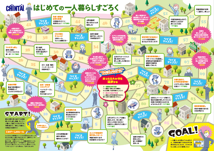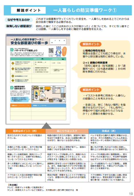 一人暮らしを始める前に知っておきたい内容を、ゲームやシミュレーション形式で学べる体験型ワークを新たに盛り込みました。契約前から入居後にかけての注意点を疑似体験できる「一人暮らしすごろく」や、条件整理から初期費用までを学べる「お部屋探しシミュレーション」、ハザードマップを確認し備えを考える「防災ワーク」など、実践的に学べる内容を用意しています。