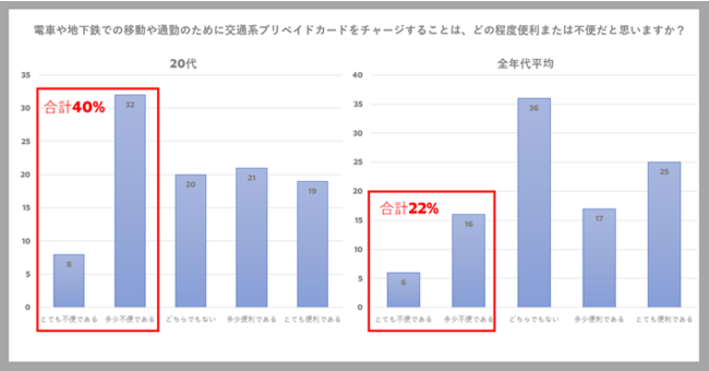 交通系プリペイドカードのチャージについては、20代では「不便である」との回答が40%にのぼり、全年代平均22%の2倍近くに。