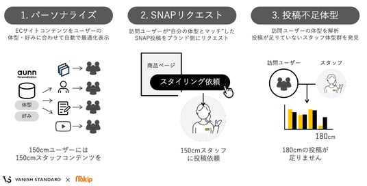 今回協業する「aunn Personalization」は、ECサイト利用者の体型と好みを解析し、ユーザーにマッチするスタッフコーディネートなどの「コンテンツ」をパーソナライズするサービスです。これは、同社が提供するECサイト上で簡単な質問に答えるだけでより良いサイズを推奨するレコメンドエンジン「unisize(ユニサイズ)」の、日本国内300サイト・200万MAU(Monthly Active Users)という膨大なデータ量による、独自のマッチングロジックが使用されています。