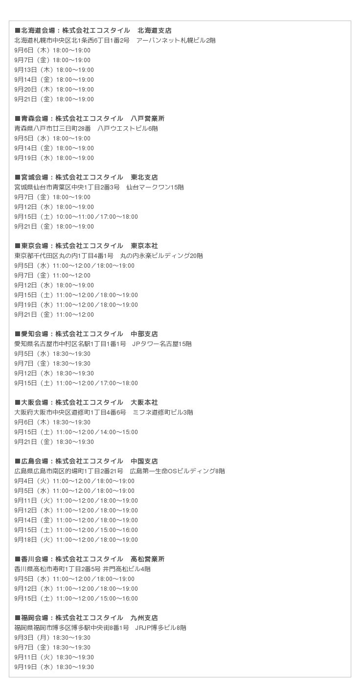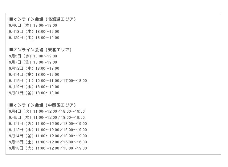 *これまで当社で契約いただいたことのないお客様限定の説明会となっております。予めご了承くださいませ。*説明会は完全予約制となっており、各回定員になり次第予約を締め切らせていただきます。