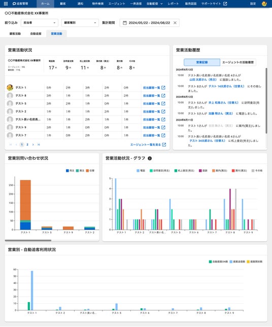 営業活動レポートは、直近の営業記録や各営業担当者ごとの問い合わせ数を確認できます。さらに、営業活動状況のグラフ機能で営業記録数を視覚的に把握し、営業別の自動追客利用状況も確認可能です。これにより、集計期間内の営業記録を確認し、営業担当者の行動量を把握して改善に役立てることができます。