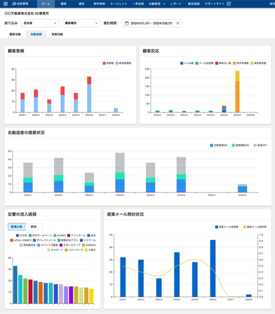 自動追客レポートは、集計期間内の顧客の登録や削除の状況を確認でき、定期的な入れ替えが行われているかを把握できます。また、顧客反応では、メール返信や見学申請などの問い合わせ状況を把握できます。さらに、自動追客の提案状況として、集計期間内の自動追客の配信設定数を確認可能です。反響の流入経路に関しては、時系列の棒グラフや割合の円グラフで確認でき、提案メール開封状況では、送信数と開封率が表示されます。