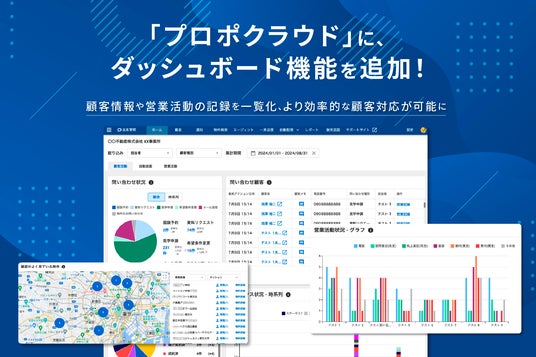 今回新たにリリースした「ダッシュボード機能」は、営業担当者がプロポクラウド上で管理している、アプローチ中の顧客情報や営業情報を自動でレポート化し、より効率的な顧客管理とデータ分析を実現する機能です。顧客からの問い合わせ内容とステータスが一覧化できることで、素早い顧客対応が可能になり、対応の抜け漏れを防ぎます。また、独自の物件データベースを活用し”顧客がよく見ている物件”を地図上で確認できるようにすることで、商圏内の人気物件が一目でわかります。さらに、各営業担当者の電話対応の回数や面談数などの営業活動状況も閲覧可能なため、営業活動の分析・改善に活用できます。