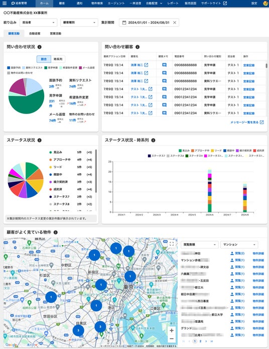 顧客活動レポートは、集計期間内の顧客からのメール返信や見学申請などの問い合わせ件数を把握できます。これに加え、問い合わせ顧客の状況やステータス変更の累計件数も確認でき、顧客の歩留まり状況を理解するのに役立ちます。また、営業活動の傾向や勝ちパターンを把握するための営業活動状況、さらに、顧客がよく閲覧している物件を地図表示で確認する機能も提供されており、商圏内の人気物件の理解に役立ちます。