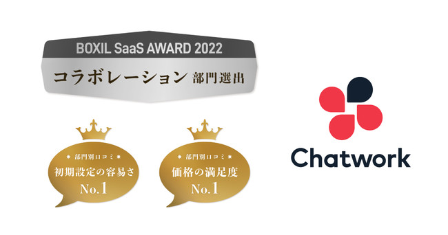 今回の「BOXIL SaaS AWARD 2022」では、「BOXIL総合ランキング部門」、「SaaS AWARD 2022部門」、「SaaS トレンド部門」の計3部門において、大賞2サービス、部門別大賞18サービス、部門別1位14サービス、部門賞109サービス(*2)が選出され、「Chatwork」は「ランキング部門 コラボレーション部門賞」および部門内評価で各項目を表彰する「ベスト評価賞」にて「初期設定の容易さNo.1」「価格の満足度No.1」を受賞する運びとなりました。
