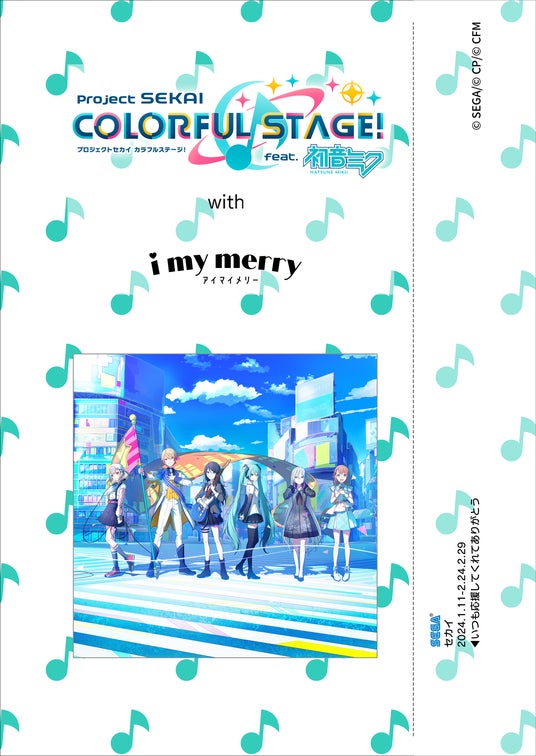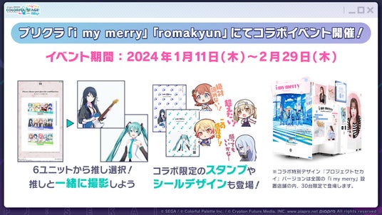 株式会社セガのプリクラ機『i my merry (アイ マイ メリー)』『romakyun (ろまきゅん)』は、iOS/Android向けリズム&アドベンチャーゲーム『プロジェクトセカイ カラフルステージ! feat. 初音ミク』とのコラボレーション企画「#ゲーセンでもプロセカ」第2弾において、期間限定のコラボイベントを2024年1月11日 (木) から実施いたします。新年はプロセカづくしのプリクラをぜひお楽しみください。