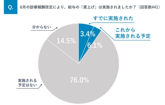 診療報酬改定により、給与の賃上げが「すでに実施された」と回答した医師は 3.4%、「これから実施される予定」と回答した医師は 6.1%となり、診療報酬改定により実際に賃上げが実施される医師は全体の 1 割以下という結果になりました。一方で「実施される予定はない」は 8 割近くにのぼる結果となりました。