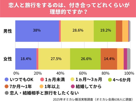 恋人と旅行するタイミングの理想について、男性の約38%が「いつでもOK」と回答。