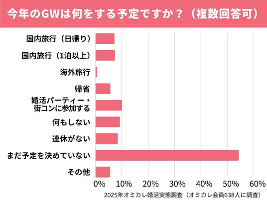 今年のゴールデンウィークは飛び石連休でやや予定が立てづらいものの、オミカレ会員の10%はすでに「婚活パーティー・街コンに参加する」の意思あり